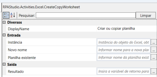 A atividade “Criar ou copiar planilha” tem como finalidade criar uma nova planilha em um arquivo Excel já aberto ou copiar uma planilha existente, permitindo a organização e reutilização de estruturas de dados dentro de processos de automação RPA.