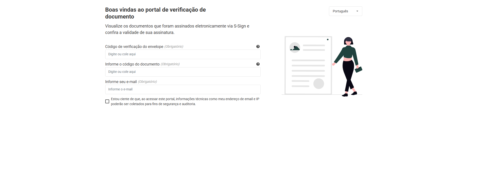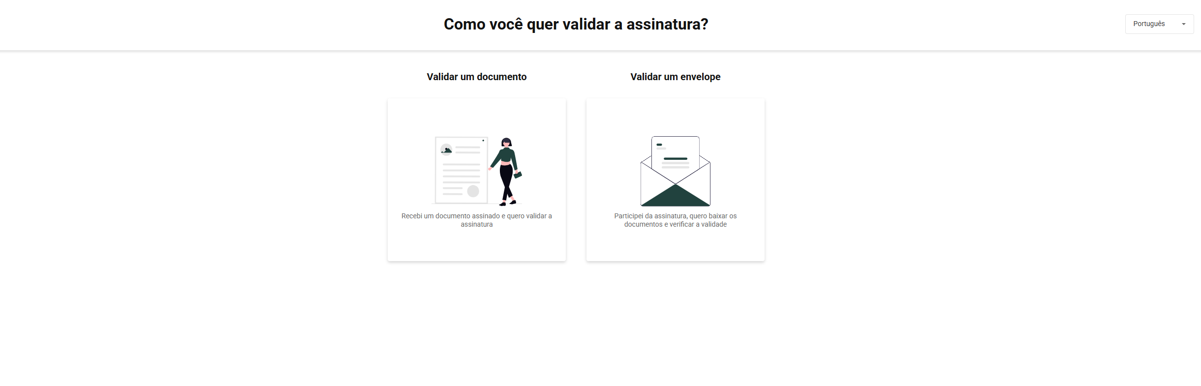 No Portal de Verificação temos duas opções de validação, Validar um documento e Validar um envelope
