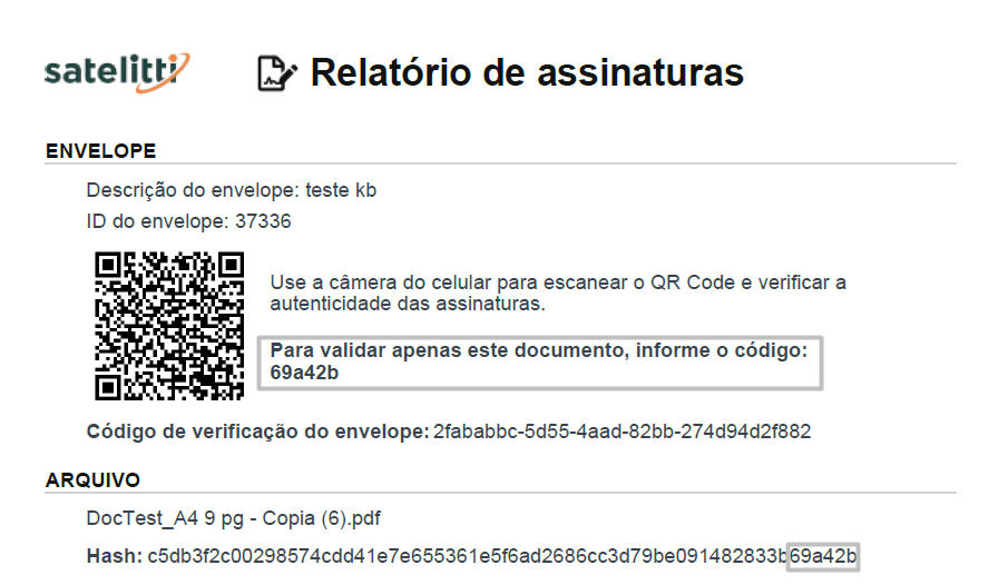 O código do documento é um campo obrigatório, você tem acesso a ele também no relatório de assinatura. Para envelopes antigos, você encontra o código do documento nos últimos seis caracteres da “Hash”, para envelopes recentes você encontra o código do documento ao lado do QR Code, segue a imagem a baixo:
