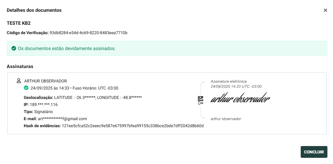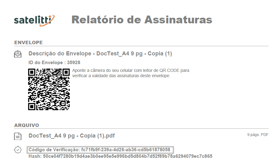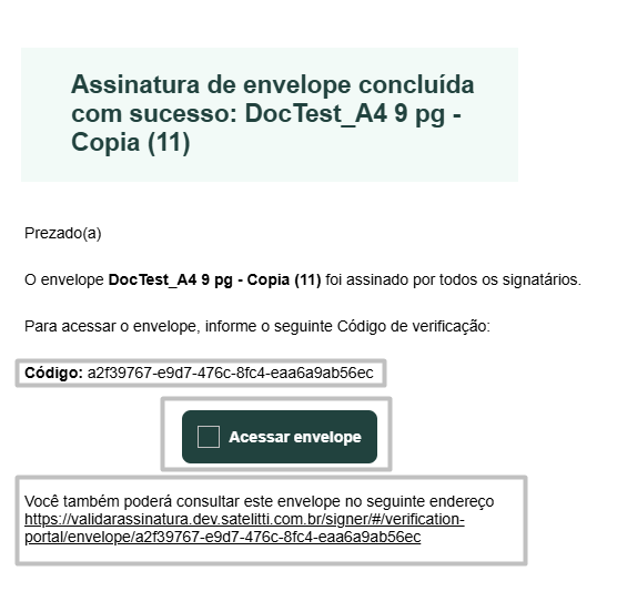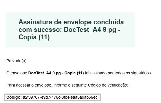 Caso o código de verificação de envelope não esteja preenchido, você tem acesso a ele no relatório de assinaturas e no Template do email de assinatura concluida.