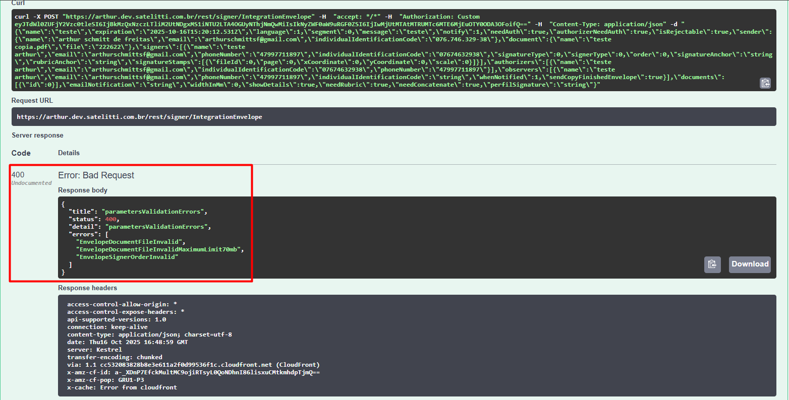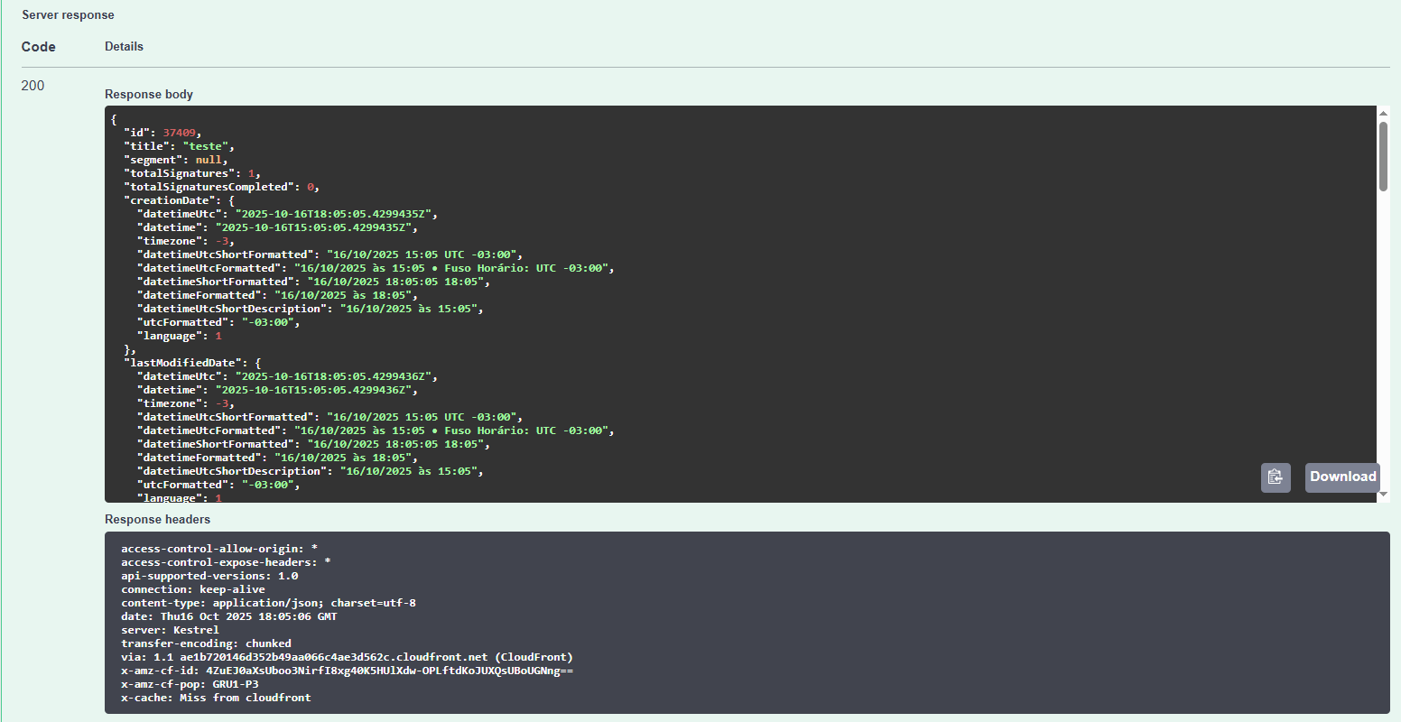 Quando a execução for feita com sucesso, o retorno será o código 200 indicando que a requisição foi executada corretamente, e no “response body” será retornado as informações e detalhes do envelope criado.