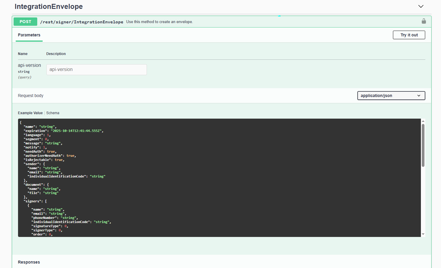 Para os campos “Documents” e “SignatureStamps” logo abaixo, o usuário deve acessar o Endpoint “rest/signer/IntegrationEnvelopeDocument” para realizar a requisição e receber o “ID” dos documentos que deseja anexar ao envelope. (o “ID”deve ser usado uma vez somente)