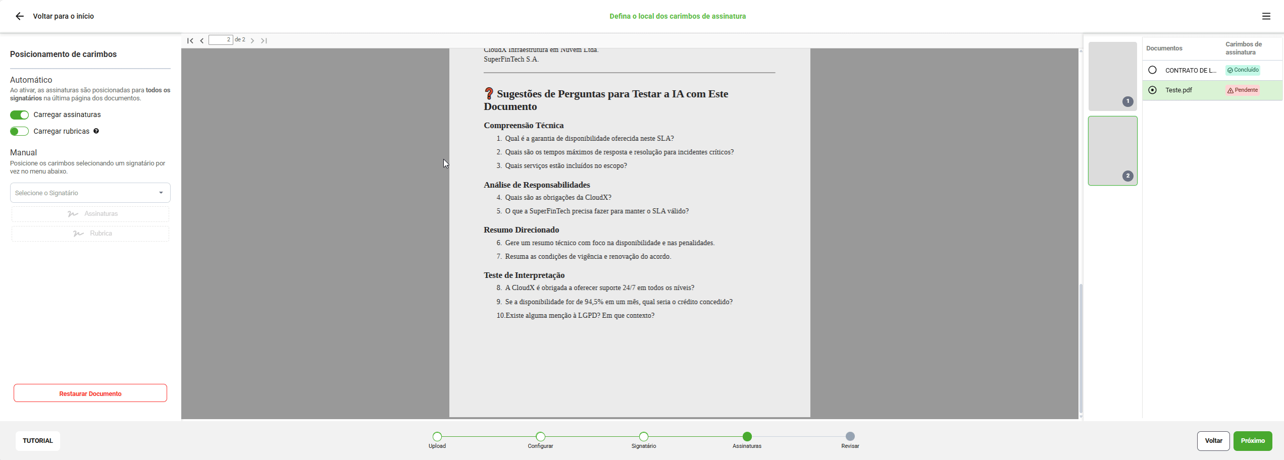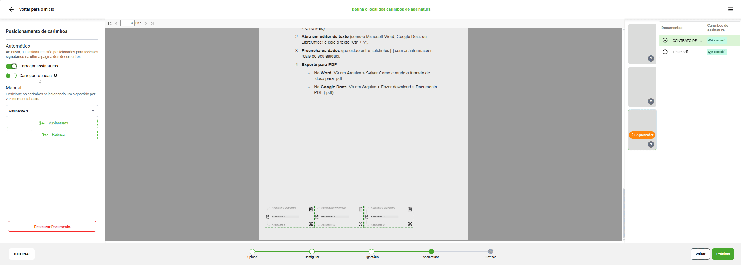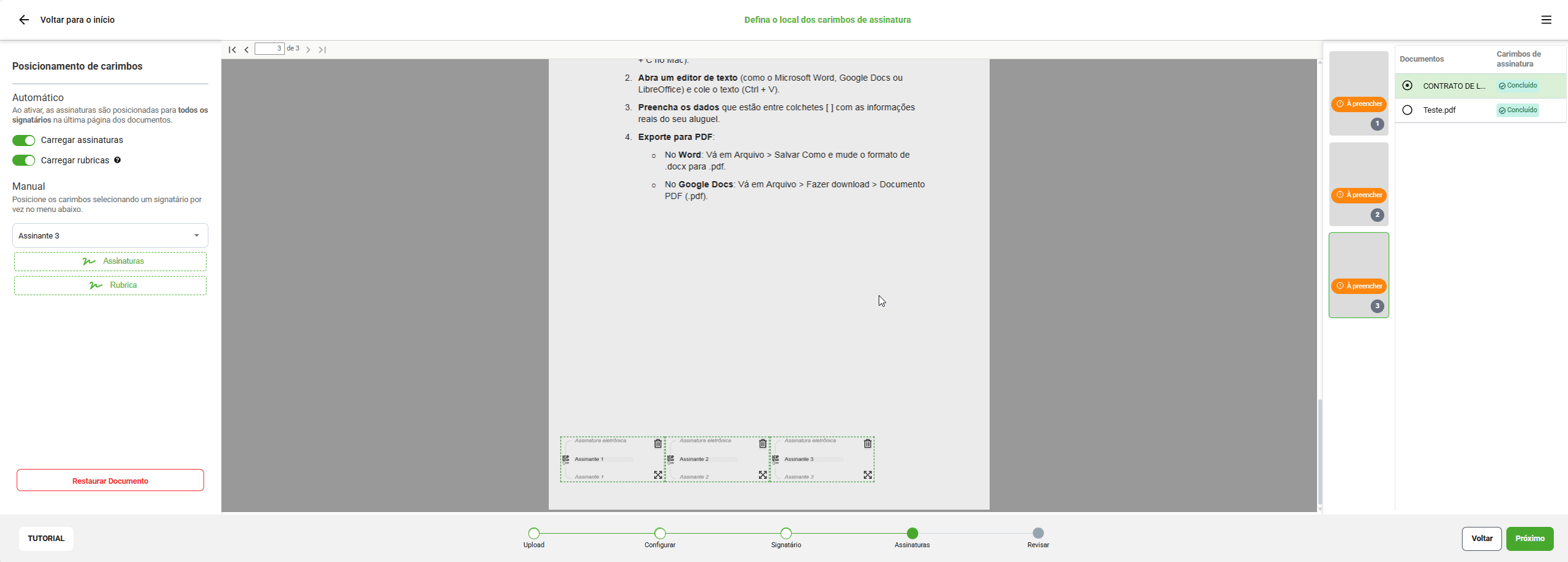 Ao acessar a etapa “Assinaturas”, será possível configurar os carimbos de assinatura e rubrica dos signatários incluídos no envelope.. Essa configuração pode ser realizada de forma automática ou manual, conforme descrito nos passos a seguir.