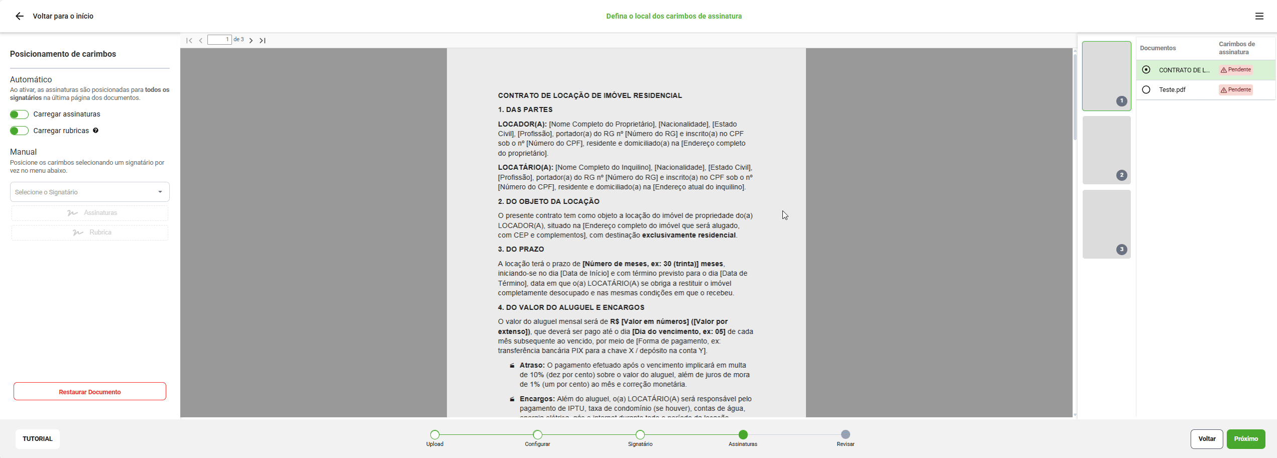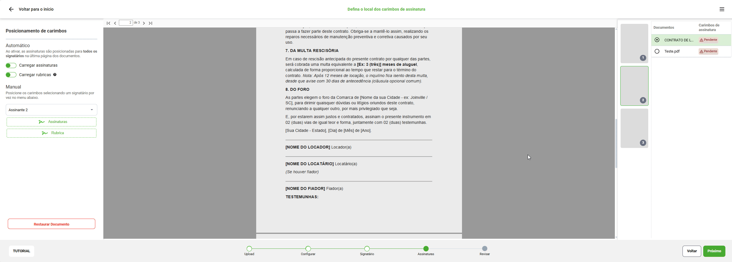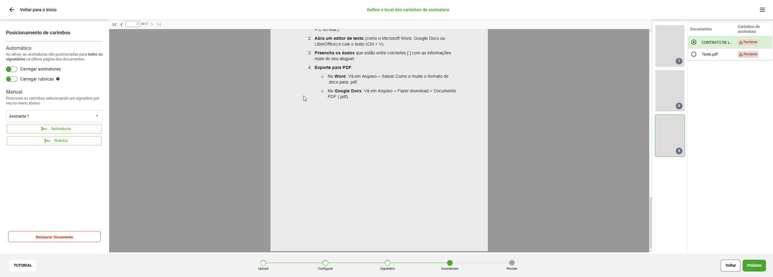 Ao acessar a etapa “Assinaturas”, será possível configurar os carimbos de assinatura e rubrica dos signatários incluídos no envelope.. Essa configuração pode ser realizada de forma automática ou manual, conforme descrito nos passos a seguir.