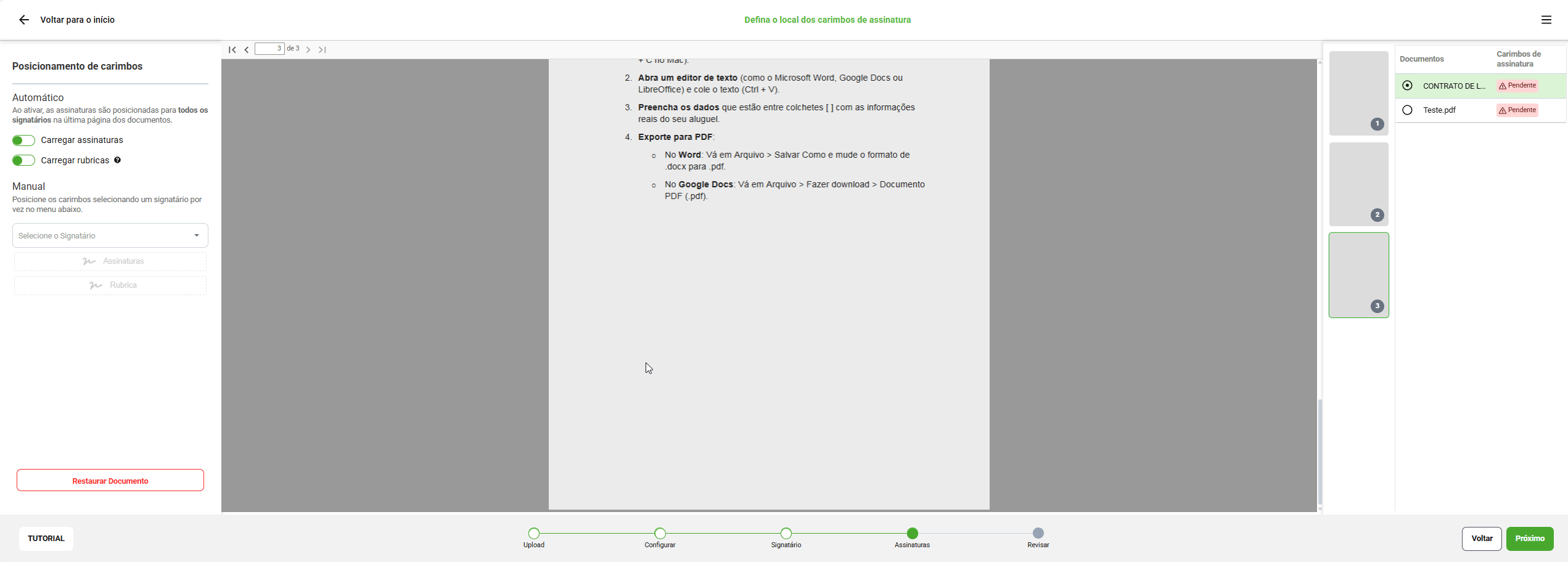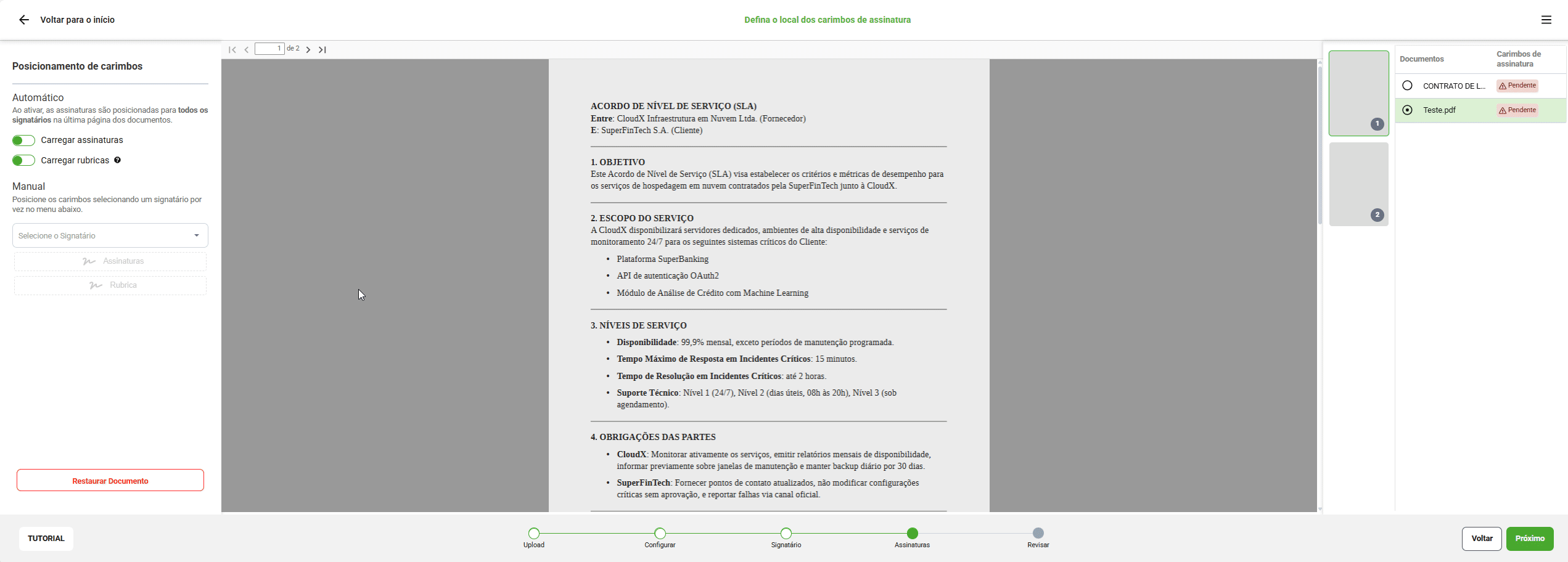 É possível clicar nos títulos dos documentos para visualizar cada um deles individualmente. Será possível visualizar outro documento somente após todos os carimbos de signatários forem posicionados no documento que está sendo visualizado.